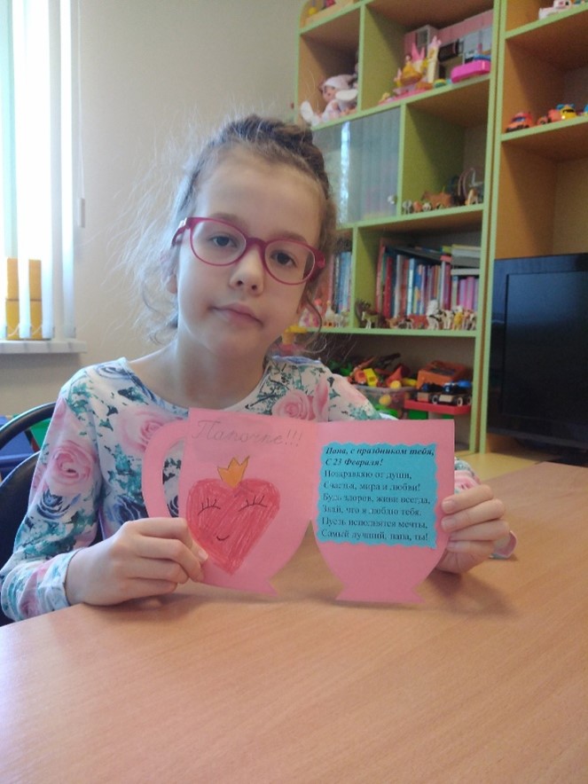 20 февраля 2025 года в преддверии праздника Дня защитника Отечества, пациенты центра провели замечательный мастер-класс «Открытка для папы», посвященный изготовлению подарков для любимых. Открытки стали символом любви и уважения, которые мы испытываем к мужчинам, стоящим на страже родины и семьи. В этих подарках включены теплые слова благодарности, ребята мастерили своими руками, чтобы сделать открытку еще более личной и значимой. Важно помнить, что проявление внимания и заботы дарит радость не только получателю, но и тому, кто дарит.