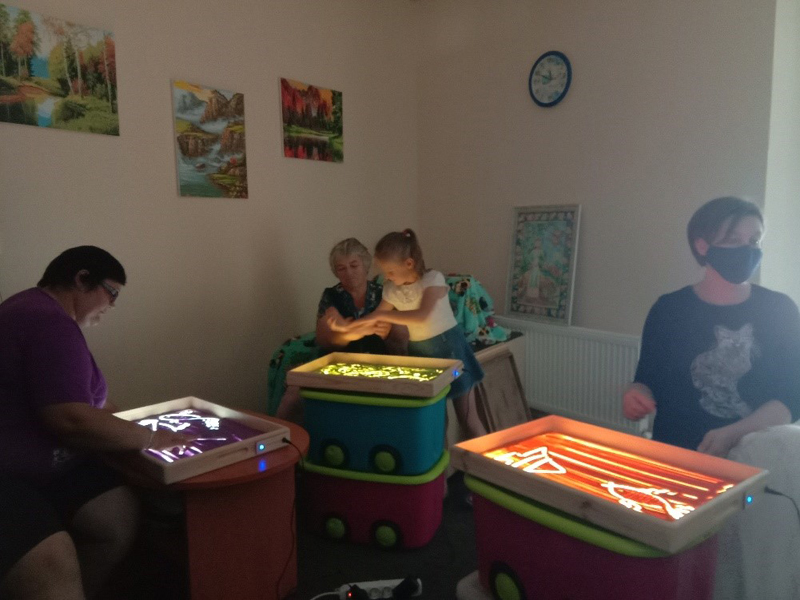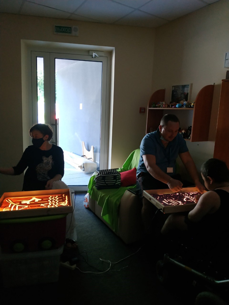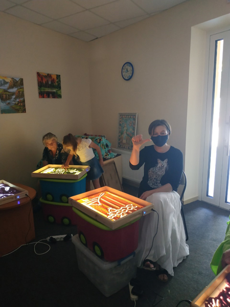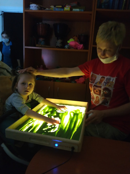 В кабинете выключен свет, звучит фоновая музыка, перед участниками – световые планшеты, на которых можно рисовать песком. Сентябрь 2020 года в Республиканском клиническом центре паллиативной медицинской помощи детям начинается с творческих встреч. Психолог, художник, преподаватель рисования песком на световом планшете Елена Епанчинцева приглашает познакомиться с песком и изучить возможности новой техники рисования. Осторожно из-под пальцев-кисточек рождаются первые рисунки.