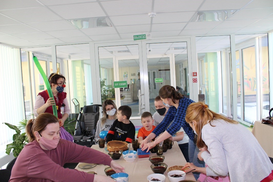 Ароматные блины испекла для всей честной компании наш добрый врач Ольга Дмитрачкова, заведующая стационарным отделением РКЦ ПМПД. Румяные, маслицем сдобренные, вкуснющие, они так и манили: «съешь еще!» Ели со смаком – с вареньицем, сметанкой да медком было просто невероятно вкусно. Блины оказались волшебные – весну-зазывательные. Чтобы весна быстрей пришла, надо, значит, блин съесть. Так нам гости добрые сказали – больничные клоуны Доктор Нос. Они сдабривали Масленицу добрыми шутками-прибаутками!